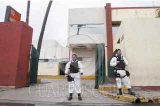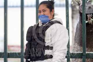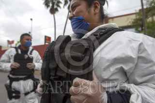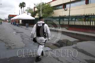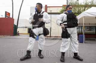 APODACA, NUEVO LEÓN, 05ABRIL2020.- Policía del municipio de Apodaca, opta por llevar trajes especiales debajo del equipo de seguridad para resguardar las entradas y salidas de posibles pacientes contagiados con Covid-19. FOTO: GABRIELA PÉREZ MONTIEL / CUARTOSCURO.COM