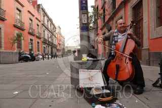 CIUDAD DE MÉXICO, 06ABRIL2020.- Un violonchelista toca algunas piezas musicales para ganarse la vida en estos tiempos en donde los transeúntes escasean por la cuarentena decretada por la pandemia de Covid-19. FOTO: MOISÉS PABLO/CUARTOSCURO.COM