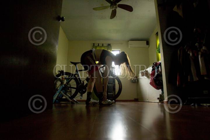 MONTERREY, NUEVO LEÓN, 07ABRIL2020.- Una deportista de alto rendimiento entrena en el rodillo desde su casa durante la cuarentena, así mismo niños y adultos mayores permanecen en sus hogares por la emergencia sanitaria. FOTO: GABRIELA PÉREZ MONTIEL / CUARTOSCURO.COM