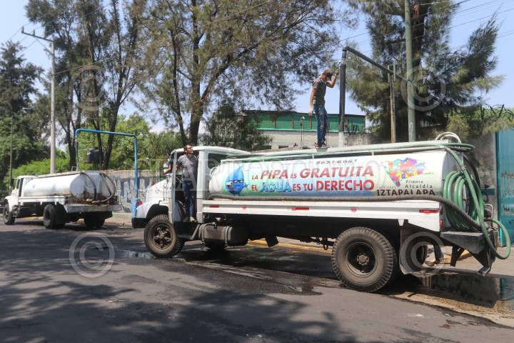 CIUDAD DE MÉXICO, 07ABRIL2020.- Debido a la escases de agua que existen en algunas colonias de la alcaldía Iztapalapa, el servicio de pipas de agua se ha acelerado para la distribución en distintos domicilios que lo solicitan por whatsapp. Previo al viaje, sanitizan la pipa de agua para evitar el posible contagio del Covid-19. En el día los trabajadores de pipas realizan de 6 a 7 viajes entre los cuales distribuyen a domicilios y unidades habitacionales. FOTO: GRACIELA LÓPEZ /CUARTOSCURO.COM