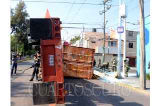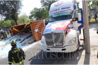 CIUDAD DE MÉXICO, 08ABRIL2020.- Un tráiler que trasportaba un contenedor cargado con vidrio en la lateral de rio Churubusco y cafetales en la colonia Granjas México, en la alcaldía de Iztacalco, volcó por presuntamente exceso de velocidad. Ninguna persona resultó herida en el percance, elementos de la secretaria de Seguridad Ciudadana y Bomberos acudieron al lugar para realizar los trabajos correspondientes. FOTO: ARMANDO MONROY /CUARTOSCURO.COM