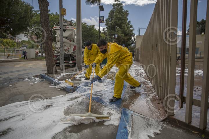 TIJUANA, BAJA CALIFORNIA, 09ABRIL2020.- Con el objetivo frenar la propagación de Coronavirus en la ciudad fronteriza, fue implementado un programa de lavado y desinfectado en áreas públicas para minimizar el riesgo de contagios masivos, esto con la colaboración del ayuntamiento de la ciudad con la empresa Cemex. Las labores de limpieza se realizaron esta mañana en el exterior del Hospital General y posteriormente en la clínica 1 del IMSS. FOTO: OMAR MARTÍNEZ /CUARTOSCURO.COM