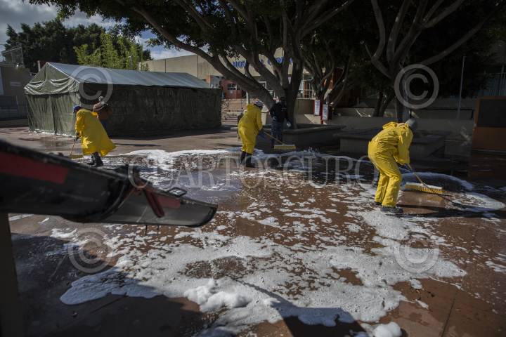TIJUANA, BAJA CALIFORNIA, 09ABRIL2020.- Con el objetivo frenar la propagación de Coronavirus en la ciudad fronteriza, fue implementado un programa de lavado y desinfectado en áreas públicas para minimizar el riesgo de contagios masivos, esto con la colaboración del ayuntamiento de la ciudad con la empresa Cemex. Las labores de limpieza se realizaron esta mañana en el exterior del Hospital General y posteriormente en la clínica 1 del IMSS. FOTO: OMAR MARTÍNEZ /CUARTOSCURO.COM