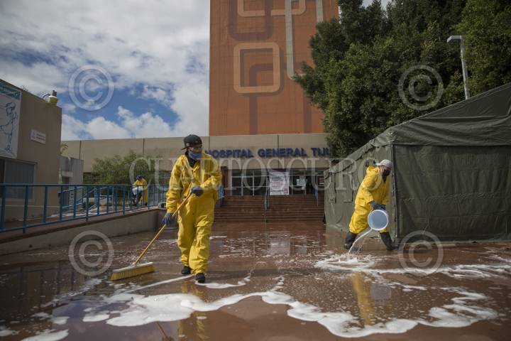 TIJUANA, BAJA CALIFORNIA, 09ABRIL2020.- Con el objetivo frenar la propagación de Coronavirus en la ciudad fronteriza, fue implementado un programa de lavado y desinfectado en áreas públicas para minimizar el riesgo de contagios masivos, esto con la colaboración del ayuntamiento de la ciudad con la empresa Cemex. Las labores de limpieza se realizaron esta mañana en el exterior del Hospital General y posteriormente en la clínica 1 del IMSS. FOTO: OMAR MARTÍNEZ /CUARTOSCURO.COM
