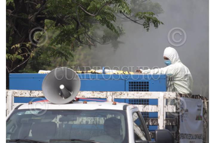 GUADALUPE, NUEVO LEÓN, 09ABRIL2020.- Un cañón aspersor sanitizante recorre colonias y avenidas del municipio de Guadalupe como medida para prevenir el contagio de coronavirus covid-19. El líquido es utilizado para desinfectar interior de hospitales y no causa daño a personas o animales y descarga cinco litros por minuto. Hasta el jueves 9 de abril se reportan seis defunciones en el estado. FOTO: GABRIELA PÉREZ MONTIEL / CUARTOSCURO.COM