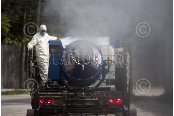 GUADALUPE, NUEVO LEÓN, 09ABRIL2020.- Un cañón aspersor sanitizante recorre colonias y avenidas del municipio de Guadalupe como medida para prevenir el contagio de coronavirus covid-19. El líquido es utilizado para desinfectar interior de hospitales y no causa daño a personas o animales y descarga cinco litros por minuto. Hasta el jueves 9 de abril se reportan seis defunciones en el estado. FOTO: GABRIELA PÉREZ MONTIEL / CUARTOSCURO.COM