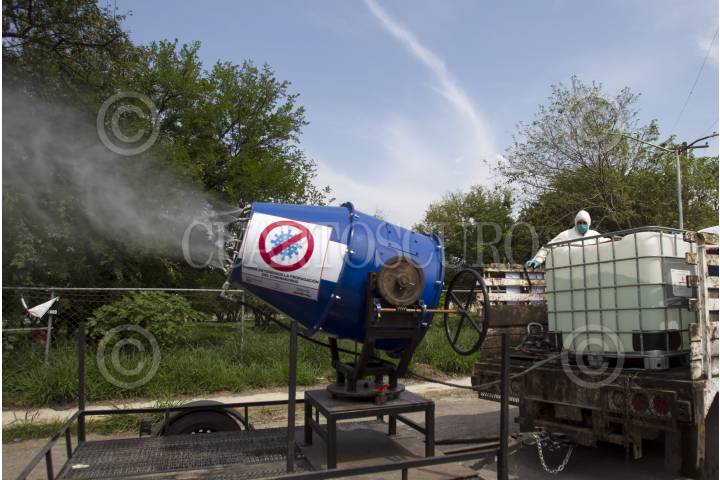 GUADALUPE, NUEVO LEÓN, 09ABRIL2020.- Un cañón aspersor sanitizante recorre colonias y avenidas del municipio de Guadalupe como medida para prevenir el contagio de coronavirus covid-19. El líquido es utilizado para desinfectar interior de hospitales y no causa daño a personas o animales y descarga cinco litros por minuto. Hasta el jueves 9 de abril se reportan seis defunciones en el estado. FOTO: GABRIELA PÉREZ MONTIEL / CUARTOSCURO.COM