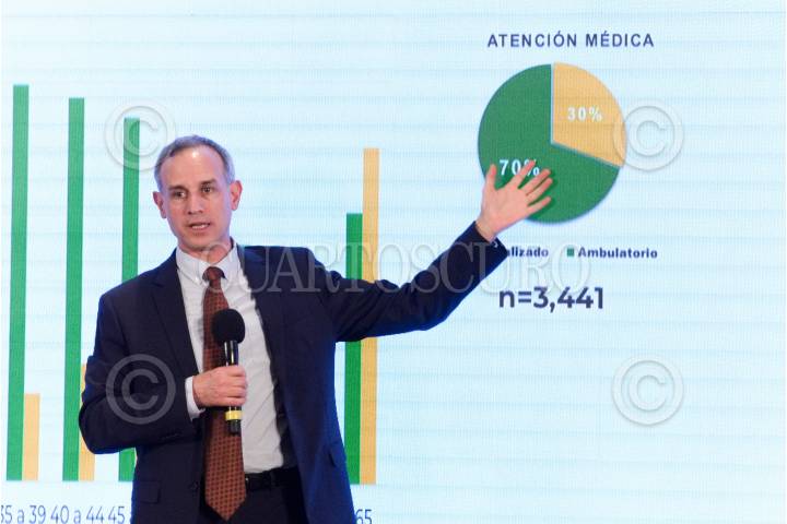 CIUDAD DE MÉXICO, 09ABRIL2020.- Hugo López-Gatell Ramírez, Subsecretario de Prevención y Promoción de la Salud, en compañía de Jorge Trejo Gómora, director general del Centro Nacional de Transfusión Sanguínea, ofreció conferencia de prensa para informar sobre la actualización de datos de la pandemia de coronavirus (covid-19) en el país. La actualización indica 3441 casos confirmados, 10,105 casos sospechosos y 194 defunciones. FOTO: MARIO JASSO /CUARTOSCURO.COM