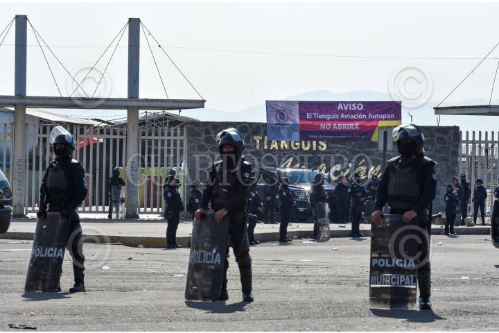 Por primera vez él Tianguis Aviación Autopan cerró sus puertas ante la contingencia por CIVID-19 como una forma de evitar aglomeraciones, desde la tarde del jueves fue resguardado el lugar por policías municipales; en este lugar se dan cita todos los viernes comerciantes de ropa, frutas y verduras, alimentos, entre otras cosas no sólo Del Valle de Toluca si no también de otros estados. FOTO: CRISANTA ESPINOSA AGUILAR /CUARTOSCURO.COM