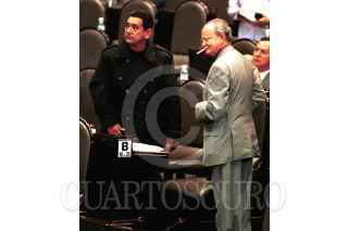 Felix Salgado Macedonio del PRD da un cigarro al priísta Salvador Rocha Díaz, quien momentos antes exigió al presidente de la mesa directiva en turno su derecho a fumar dentro del salón de plenos, de la Cámara de Diputados. FOTO: Pedro Mera/CUARTOSCURO.COM