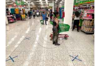 CIUDAD DE MÉXCO DE MÉXICO, 10ABRIL2020.- Supermercados de la ciudad, colocaron señalizaciones en el piso, las cuales indican la sana distancia que deben observar los clientes en lugares de mayor aglomeración para evitar el contagio y propagación del COVID-19. FOTO: ROGELIO MORALES /CUARTOSCURO.COM