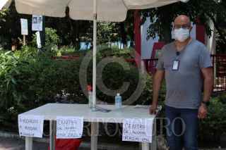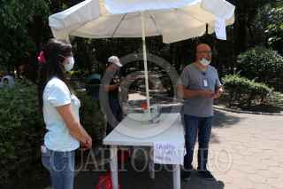 CIUDAD DE MÉXICO, 11ABRIL2020.- Raúl Vega Ortíz, Inhaloterapeuta del Hospital General del Centro Médico la Raza, colocó un centro de acopio en el parque de la China, en la alcaldía de Azcapotzalco, junto a la estatua de José José solicitando a la población donativos de material como cubrebocas o gel antibacterial, o bien, sumas en efectivo para la compra de los mismos para continuar atendiendo a pacientes con Covid-19. El especialista explica que aunque cuentan aún con algunos insumos estos son insuficientes para hacer frente a la pandemia, y que ponen en riesgo su salud y de sus compañeros. FOTO: GALO CAÑAS /CUARTOSCURO.COM