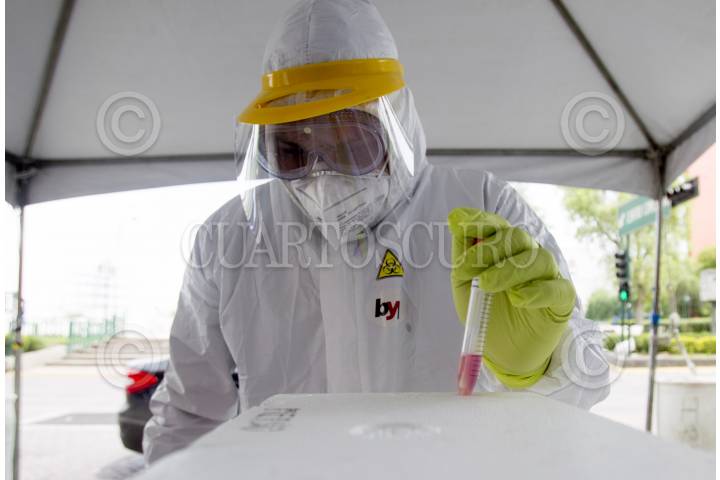 MONTERREY, NUEVO LEÓN 11ABRIL2020.- Se instalan tres módulos para ampliar la detección de casos de coronavirus Covid-19 en la entidad en puntos drive-thru. Se aplicarán a personas con síntomas como fiebre, tos, dolor de garganta y malestar en general, así como personas que hayan tenido contacto con un caso confirmado de Covid-19. FOTO: GABRIELA PÉREZ MONTIEL / CUARTOSCURO.COM