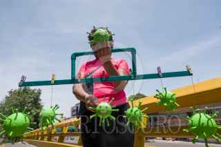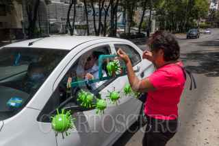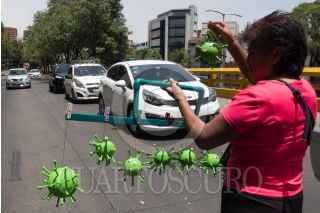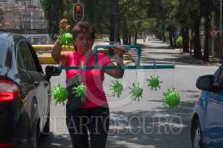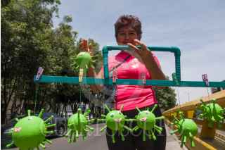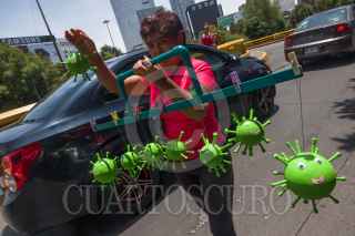 CIUDAD DE MÉXICO, 12ABRIL2020.- Una comerciante oferta sus Covid-19 en 50 y 70 pesos, ella se dedica a la venta de diversos artículos en crucero de avenida de la capital. Cuenta que hace unos días estaba viendo un programa por televisión cuando vio un reportaje de piñatas alusivas al Coronavirus y se le ocurrió la idea de hacer sus propios souvenirs; "antes de nos ganen los chinos", dice con una sonrisa. Comenta que las ventas no son muy buenas pero que la gente se divierte con sus figuritas, y para ella también es importante mirarle el lado amable a esta pandemia. FOTO: MOISÉS PABLO/CUARTOSCURO.COM