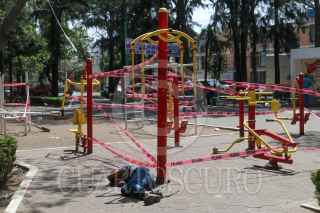 CIUDAD DE MÉXICO, 12ABRIL2020.- En el marco de la Emergencia Sanitaria Nacional por la pandemia del Coronavirus, aparatos para realizar ejercicio y juegos se mantienen clausurados para evitar el posible contagio del Covid-19 en la alcaldía Iztapalapa FOTO: GRACIELA LÓPEZ /CUARTOSCURO.COM
