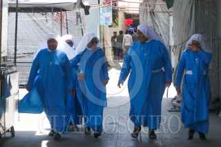 CIUDAD DE MÉXICO, 12ABRIL2020.- Un grupo de monjas camina entre los puestos cerrados que se encuentran en la explanada de la alcaldía Iztapalapa. FOTO: GRACIELA LÓPEZ /CUARTOSCURO.COM