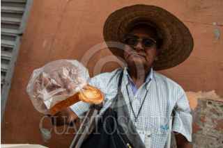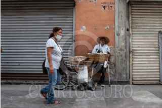CIUDAD DE MÉXICO, 15ABRIL2020.- El señor Paulino vende pan Campechano, oreja y polvoron; 4 piezas por 10 pesos en la calle Corregidora Josefa Ortíz de Domínguez esquina Correo Mayor en el Centro Histórico a una cuadra del Palacio Nacional. El y su esposa todos los días vienen desde Texcoco para ofrecer su pan en dos canastas montadas en una bicicleta. Con el “Quédate en Casa” recomendado por la Secretaria de Salud para evitar aglomeraciones y por ende la propagación de la pandemia del Virus COVID-19, han bajado sus ventas de manera significativa, sin que sea opción no salir a trabajar ya que el y su familia dependen de la ventas diarias del pan. FOTO: ANDREA MURCIA /CUARTOSCURO.COM