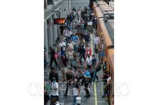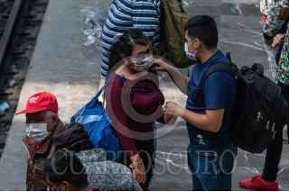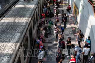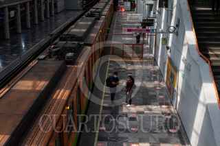 CIUDAD DE MÉXICO, 17ABRIL2020.- Aspecto de la Linea Morada estación pantitlán. Ante la afluencia mayor de usuarios en esta linea se colocaron señalamientos para respetar la “La sana distancia” que pocos llevan a cabo sobre todo al entrar y salir de vagones. FOTO: ANDREA MURCIA/CUARTOSCURO.COM