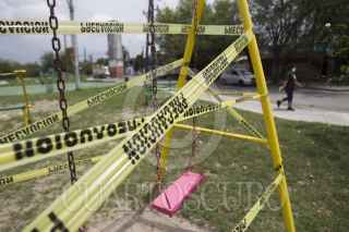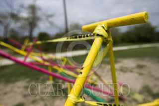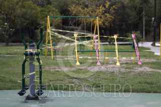 GUADALUPE, NUEVO LEÓN, 18ABRIL2020.- Juegos infantiles son asegurados para que los ciudadanos no acudan a los parques púbicos con niños en el interior de las colonias en el área metropolitana de Monterrey durante la contingencia por el coronavirus. Hasta el 18 de abril se reportan 7 defunciones en el estado de Nuevo León. FOTO: GABRIELA PÉREZ MONTIEL / CUARTOSCURO.COM