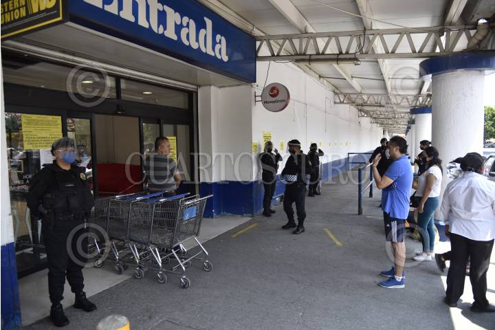 CIUDAD DE MÉXICO, 18ABRIL2020.- Como parte medidas de prevención durante la alerta sanitaria Fase 2 por coronavirus (covid-19), supermercados La ciudad continúan aplicando filas con sana distancia, ingresos de una persona por entidad y operativos de seguridad en el exterior por parte de elementos de la Secretaría de Seguridad Ciudadana (SSC). FOTO: MARIO JASSO /CUARTOSCURO.COM