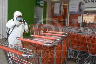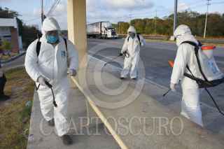 PUERTO MOELOS, QUINTANA ROO.-Está en marcha un programa de sanitización con brigadas de trabajadores municipales que acuden a establecimientos comerciales para aplicar sanitizante y así mantener desinfectadas estructuras que tocamos con frecuencia como manijas, puertas, pasamanos, anaqueles y carritos de compra, entre otros, esto para reforzar las medidas de higiene y combate al Covid-19. Este procedimiento abarca también paraderos de transporte público en todo el municipio. ELIZABETH RUIZ /CUARTOSCURO.COM