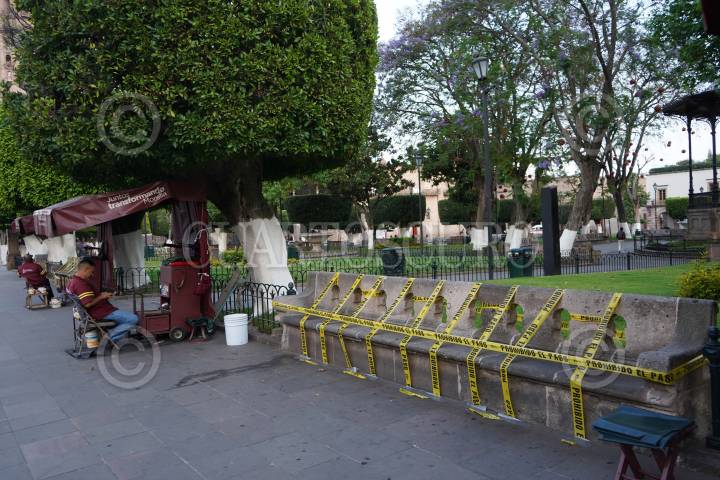 MORELIA, MICHOACÁN. 20ABRIL2020. Hoy se decretó en Michoacan el confinamiento obligatorio a causa de la pandemia originada por el Coronavirus. El gobernador hizo el anunció y en la calle, parece que es el “día de prueba”. En las plazas públicas del Centro de Morelia, colocaron cinta amarilla en algunas bancas para evitar que se sienten. FOTO: JUAN JOSÉ ESTRADA SERAFÍN /CUARTOSCURO.COM