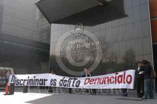MEXICO, D.F., 09FEBRERO2006,- Continúan las protestas encontra de la cedena hotelera Sheraton, por la injustificada expulsión de diplomáticos cubanos de uno de sus hoteles. En la imagen una manta con la leyenda "Discriminar es Delito Denuncialo, en la puerta del Sheraton Centro Histórico". FOTO: Moisés Pablo/CUARTOSCURO.COM