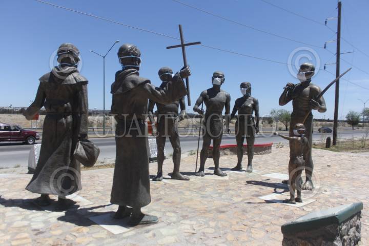 CIUDAD JUÁREZ, CHIHUAHUA, 21ABRIL2020.- Diversos monumentos de Ciudad Juárez portaban este día cubrebocas. Esto como medida de concientización para que los juarenses tomen las debidas precauciones ante la pandemia del COVID-19. Son varias las estatuas en esta localidad las que llevan puesto un cubrebocas de tela. Cabe señalar que las medidas recomendadas por autoridades son evitar salir de casa y, de ser necesario hacerlo, mantener distancia con otras personas, además de toser o estornudar cubriéndose con la parte interna del codo. FOTO: NACHO RUIZ /CUARTOSCURO.COM