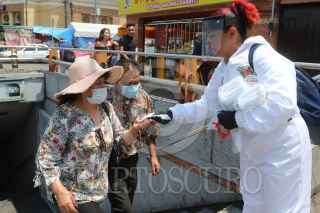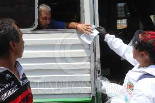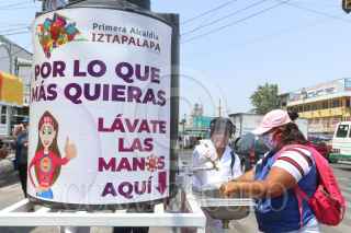 CIUDAD DE MÉXICO, 22ABRIL2020.- En el marco de la fase 3, decretada ayer por la Secretaría de Salud, trabajadores de la alcaldía Iztapalapa invitan a los transeúntes a lavarse las manos en un tinaco colocado en avenida Ermita Iztapalapa, utilizar gel antibacterial y usar cubrebocas para no seguir propagando el Coronavirus en la capital. FOTO: GRACIELA LÓPEZ /CUARTOSCURO.COM