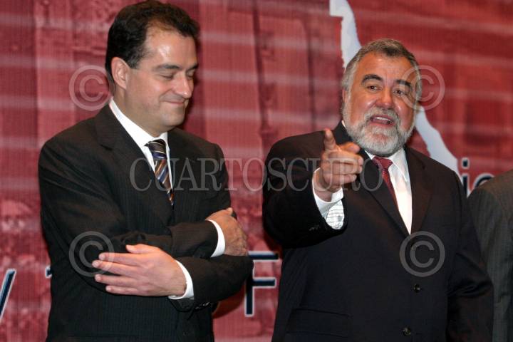 MEXICO, D.F., 09FEBRERO2006.- Eduardo Medina Mora, Secretario de Seguridad Pública Federal, Daniel Cabeza de Vaca, Procurador de República , Alejandro Encinas, jefe de gobierno, Bernardo Batiz, Procurador del DF, Joel Ortega, Secretario de Seguridad Pública del DF y Emilio Alvárez Icaza, presidente de la CDHDF, durante la XVII Reunión del Pleno de la Conferencia Nacional de Procuración de Justicia, en un hotel de la capital. FOTO: Moisés Pablo/CUARTOSCURO.COM