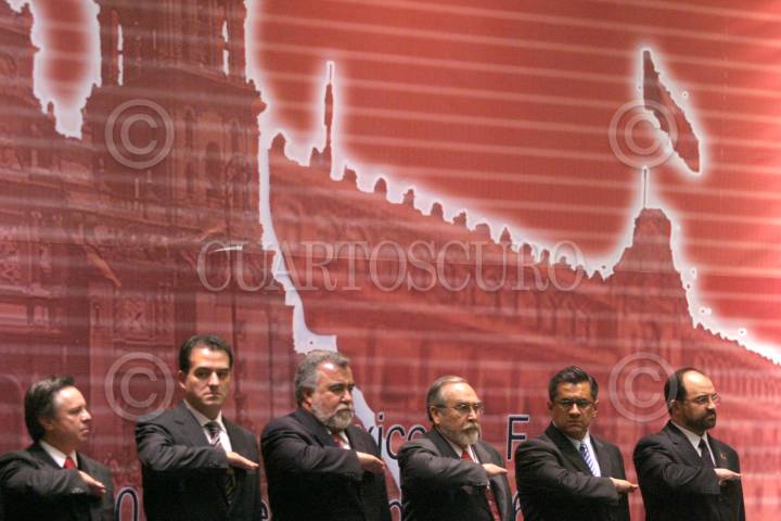 MEXICO, D.F., 09FEBRERO2006.- Eduardo Medina Mora, Secretario de Seguridad Pública Federal, Daniel Cabeza de Vaca, Procurador de República , Alejandro Encinas, jefe de gobierno, Bernardo Batiz, Procurador del DF, Joel Ortega, Secretario de Seguridad Pública del DF y Emilio Alvárez Icaza, presidente de la CDHDF, durante la XVII Reunión del Pleno de la Conferencia Nacional de Procuración de Justicia, en un hotel de la capital. FOTO: Moisés Pablo/CUARTOSCURO.COM