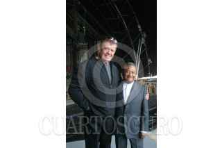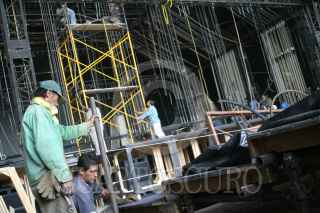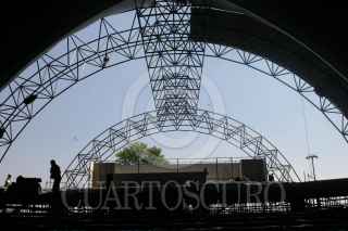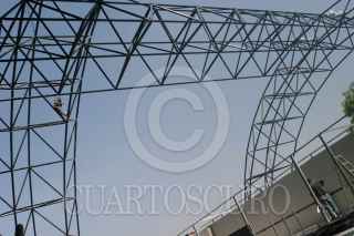 MÉXICO, D.F. 09FEBRERO2006.- En la plaza Cuicuilco obreros trabajan en la estructura del Pabellón de Alta Tecnología , teatro Itinerante con capacidad para mil personas que es construido especialmente para el musical Ciudad Blanca. FOTO:Miriam Sánchez/CAURTOSCURO.COM
