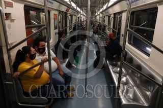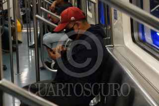 CIUDAD DE MÉXICO, 26ABRIL2020.- Ciudadano viajan con cubrebocas en el metro en donde se declaró el uso obligatorio para detener los contagios de Covid-19 en la ciudad, por la mañana la Jefa de Gobierno anunció que a partir del día de mañana su uso era obligatorio en la calle. FOTO: MOISÉS PABLO/CUARTOSCURO.COM