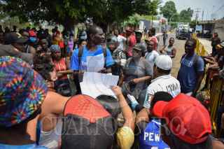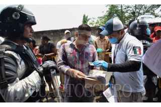 TAPACHULA, CHIAPAS. 27ABRIL2020.- Los migrantes extracontinentales se amontonan para entregar sus documentos afuera de las oficinas de Migración, en plena contingencia fase 3, los inmigrantes no portan cubrebocas. Elementos de la Guardia Nacional vigilan a los migrantes que solicitan el servicio. FOTO: DAMIÁN SÁNCHEZ/CUARTOSCURO.COM