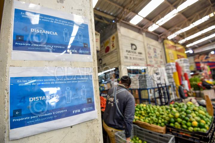 La vida en la Central de Abastos de Toluca continúa aunque con todas las medidas de prevención para evitar cualquier contagio por COVID-19, las personas acuden con cubrebocas y en los puestos los comerciantes colocaron gel antibacterial y usan también cubrebocas, se colocaron mantas en las diversas entradas de las naves para invitar a los usuarios a cumplir con todas las medidas preventivas. FOTO: CRISANTA ESPINOSA AGUILAR /CUARTOSCURO.COM