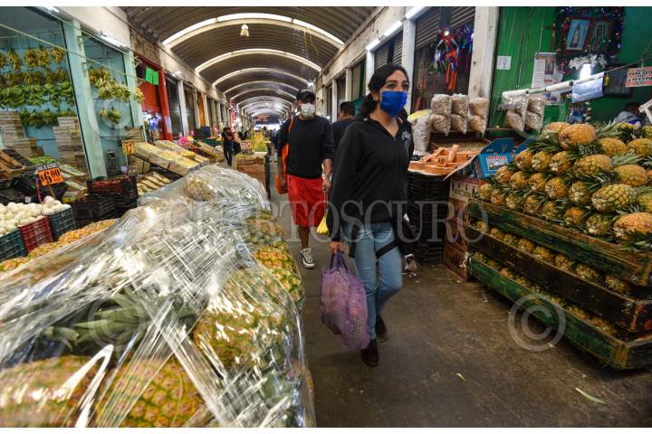 La vida en la Central de Abastos de Toluca continúa aunque con todas las medidas de prevención para evitar cualquier contagio por COVID-19, las personas acuden con cubrebocas y en los puestos los comerciantes colocaron gel antibacterial y usan también cubrebocas, se colocaron mantas en las diversas entradas de las naves para invitar a los usuarios a cumplir con todas las medidas preventivas. FOTO: CRISANTA ESPINOSA AGUILAR /CUARTOSCURO.COM