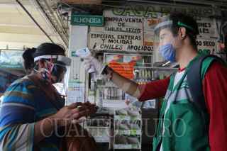 CIUDAD DE MÉXICO, 28ABRIL2020.- En las inmediaciones de la Central de Abastos empezaron a utilizar medidas sanitarias como la toma de temperatura en la entrada principal y pasillos, uso de gel antibacterial y el uso correcto de cubrebocas. Las personas que se encuentren con más de 37º grados no podrán ingresar a las instalaciones. FOTO: GRACIELA LÓPEZ /CUARTOSCURO.COM