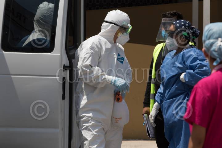 CIUDAD DE MÉXICO, 29ABRIL2020.- Una ambulancia particular traslado a un hombre al Hospital General en donde están atendiendo a pacientes con Covid-19, el paciente iba con los síntomas de esta enfermedad y oxígeno artificial. Los paramédicos que iban en la unidad charlaron con los doctores responsables de la Unidad de Triage Respiratorio y tras más de una hora, en donde los hombres ataviados de blanco descansaron parados por un período de 15 minutos, tuvieron que llevarse al paciente a otro lado por la falta de camas disponibles en este nosocomio. FOTO: MOISÉS PABLO/CUARTOSCURO.COM
