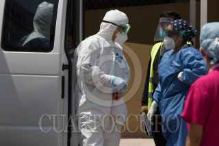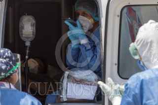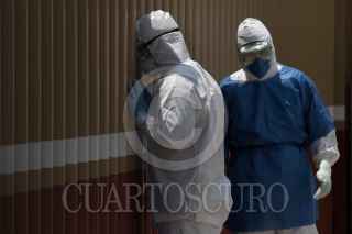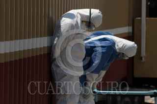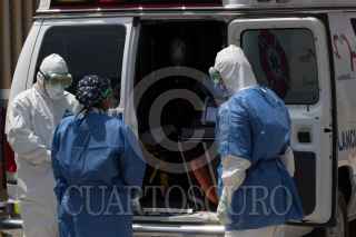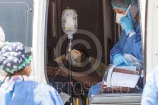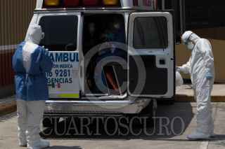 CIUDAD DE MÉXICO, 29ABRIL2020.- Una ambulancia particular traslado a un hombre al Hospital General en donde están atendiendo a pacientes con Covid-19, el paciente iba con los síntomas de esta enfermedad y oxígeno artificial. Los paramédicos que iban en la unidad charlaron con los doctores responsables de la Unidad de Triage Respiratorio y tras más de una hora, en donde los hombres ataviados de blanco descansaron parados por un período de 15 minutos, tuvieron que llevarse al paciente a otro lado por la falta de camas disponibles en este nosocomio. FOTO: MOISÉS PABLO/CUARTOSCURO.COM
