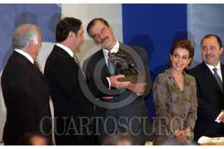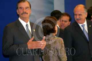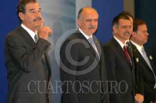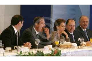 MEXICO, D.F., 23FEBRERO2006.- Luis Antonio Mahbub Sarquis, presidente de la CONCANACO, Vicente Fox Quesada, Presidente de la República, Marta Sahagún, esposa de mandatario y Raul Alejandro Padilla, CONCANACO, durante la ceremonia de la 90 Asamblea General Ordinaria de la CONCANACO, en un hotel de la zona de Polanco. FOTO: Moisés Pablo/CUARTOSCURO.COM