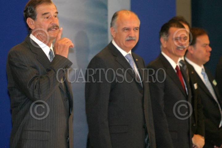 MEXICO, D.F., 23FEBRERO2006.- Luis Antonio Mahbub Sarquis, presidente de la CONCANACO, Vicente Fox Quesada, Presidente de la República, Marta Sahagún, esposa de mandatario y Raul Alejandro Padilla, CONCANACO, durante la ceremonia de la 90 Asamblea General Ordinaria de la CONCANACO, en un hotel de la zona de Polanco. FOTO: Moisés Pablo/CUARTOSCURO.COM