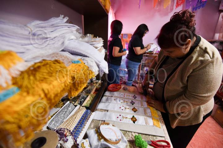 La familia Morán Alcantara lleva más de 25 años dedicándose a la elaboración de flores de papel y plástico, sábanas bordadas, pegadas con aplicaciones o deshiladas, que sirven para vestir las cruces para la celebración católica de la Santa Cruz que se realiza el próximo 3 de Mayo, ante la contingencia por COVID-19 no pueden instalarse como cada año en el mercado de temporada, y para que su trabajo que inician en el mes de Enero no se quede y tengan grandes pérdidas económicas han optado por crear un catálogo y subirlo en redes sociales, y poder llevarlo a domicilio, operan en las delegaciones de San a Buenaventura, Capultitlán en Toluca, y en el municipio de Metepec; la entrega de los artículos van con todas las medidas sanitarias desde el empaquetado de las flores y las sábanas hasta la entrega. FOTO: CRISANTA ESPINOSA AGUILAR /CUARTOSCURO.COM