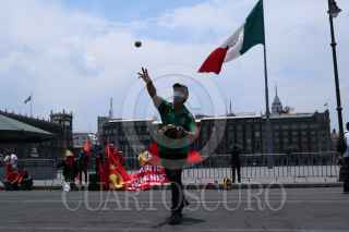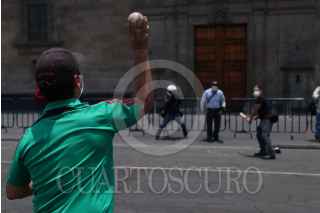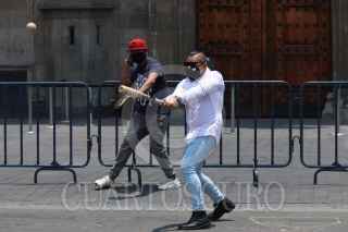 CIUDAD DE MÉXICO, 01MAYO2020.- Con un juego de baseball en pleno circuito Zócalo, representantes de diversos sindicatos se manifestaron con motivo del Día Internacional del Trabajo. Debido a la contingencia por Covid-19 en el país, este año no se presentaron marchas o congregaciones multitudinarias. FOTO: GALO CAÑAS /CUARTOSCURO.COM