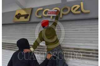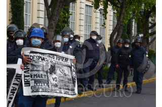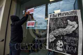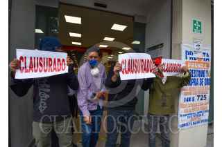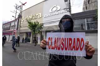 Integrantes de diversos colectivos se manifestaron en el marco del Día del Trabajo, y de forma simbólica clausuraron tres tiendas en la ciudad de Toluca que mantienen operación a pesar de no entrar en negocios con actividad de primera necesidad durante la fase 3 de la contingencia por COVID-19. FOTO: CRISANTA ESPINOSA AGUILAR /CUARTOSCURO.COM