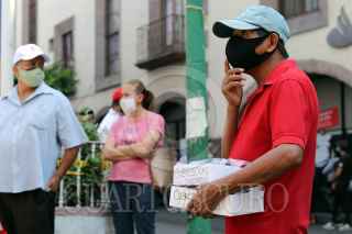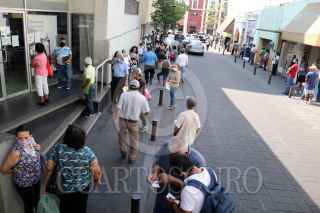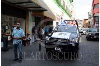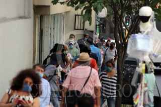 CUERNAVACA, MORELOS, 04MAYO2020.- Decenas de clientes de bancos ubicados en el centro de la ciudad hacen cola para ingresar y realizar trámites, esto provoco que una patrulla circulara por la zona exigiendo a los gerentes que organizaran a la gente para evitar contagios por Covid-19. FOTO: MARGARITO PÉREZ RETANA /CUARTOSCURO.COM
