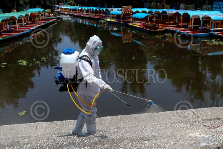 CIUDAD DE MÉXICO, 05MAYO2020.- Trabajadores de la alcaldía Xochimilco sanitizaron la zona de chinampas, el embarcadero Fernando Celada, el Mercado de Xochimilco y el transporte público como parte de las medidas sanitarias para no propagar más el virus durante la Fase 3 de la Emergencia Sanitaria Nacional por la pandemia del Coronavirus. FOTO: GRACIELA LÓPEZ /CUARTOSCURO.COM