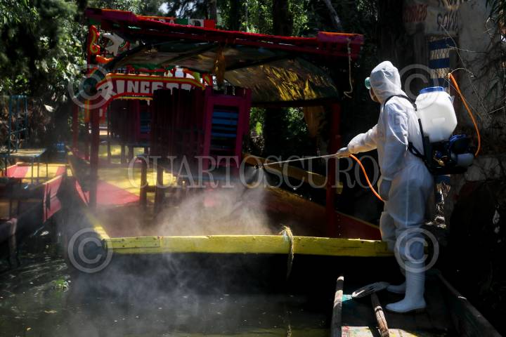 CIUDAD DE MÉXICO, 05MAYO2020.- Trabajadores de la alcaldía Xochimilco sanitizaron la zona de chinampas, el embarcadero Fernando Celada, el Mercado de Xochimilco y el transporte público como parte de las medidas sanitarias para no propagar más el virus durante la Fase 3 de la Emergencia Sanitaria Nacional por la pandemia del Coronavirus. FOTO: GRACIELA LÓPEZ /CUARTOSCURO.COM