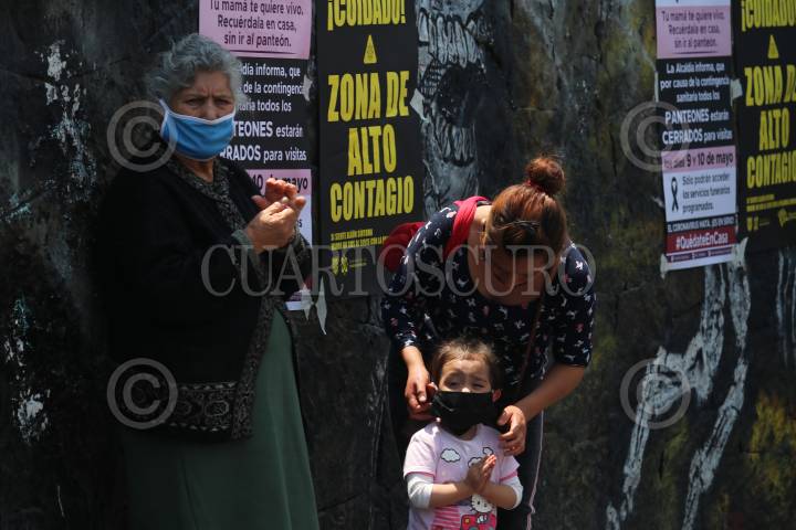CIUDAD DE MÉXICO, 06MAYO2020.- En las inmediaciones del Panteón San Nicolás Tolentino colocaron una manta anunciando que sólo estará abierto a servicios funerarios debido a la contingencia por la pandemia del Coronavirus. Así mismo el 8 y 9 permanecerá cerrado para evitar el contagio del Covid-19. Las familias y funerarias continúan arribando al cementerio para dar el último adiós a sus seres queridos. El acceso para entierro es de 15 personas, 5 si es cremación y 1 si es para caso de Coronavirus. FOTO: GRACIELA LÓPEZ /CUARTOSCURO.COM