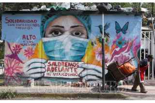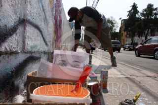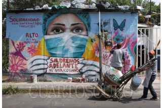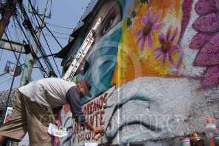 CIUDAD DE MEXICO 06MAYO2020.- El artista urbano, "Kato", continúa realizando murales en apoyo al personal médico, con mensajes como alto a las agresiones y saldremos adelante, el artista intervino un mural ubicado en Periférico y avenida Toluca. ROGELIO MORALES /CUARTOSCURO.COM