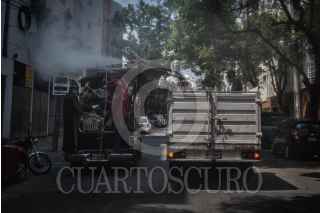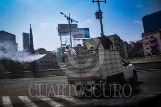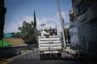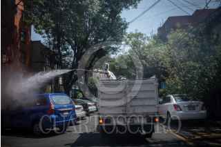 CIUDAD DE MÉXICO, 09MAYO2020.- Trabajadores de la Alcaldía Miguel Hidalgo, como parte del Programa de Sanitización, recorren a bordo de una camioneta las calles de la Colonia Escandón y sus alrededores, rociando una solución sanitizante para desinfectar espacios y superficies, esto en el marco de la emergencia sanitaria. FOTO: PEDRO ANZA /CUARTOSCURO.COM